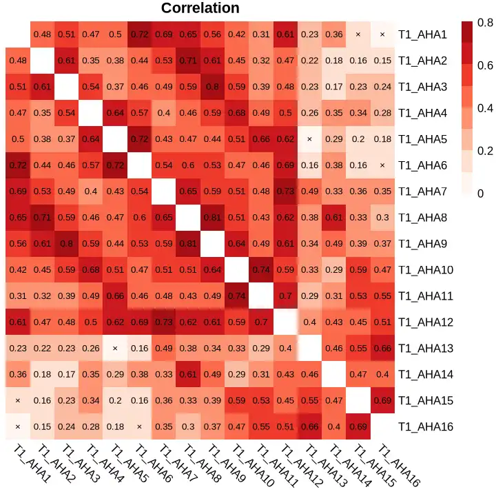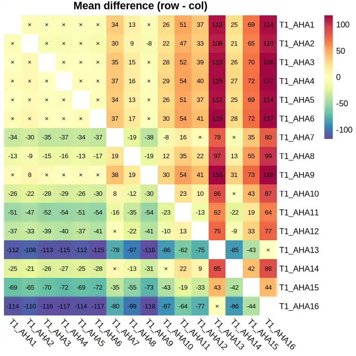 alpha <- 0.05 diag(diff_mat) <- NA mark_x <- ifelse(!is.na(p_adj) & p_adj < alpha, formatC(diff_mat, digits = 0, format = "f"), "×") diag(mark_x) <- ""